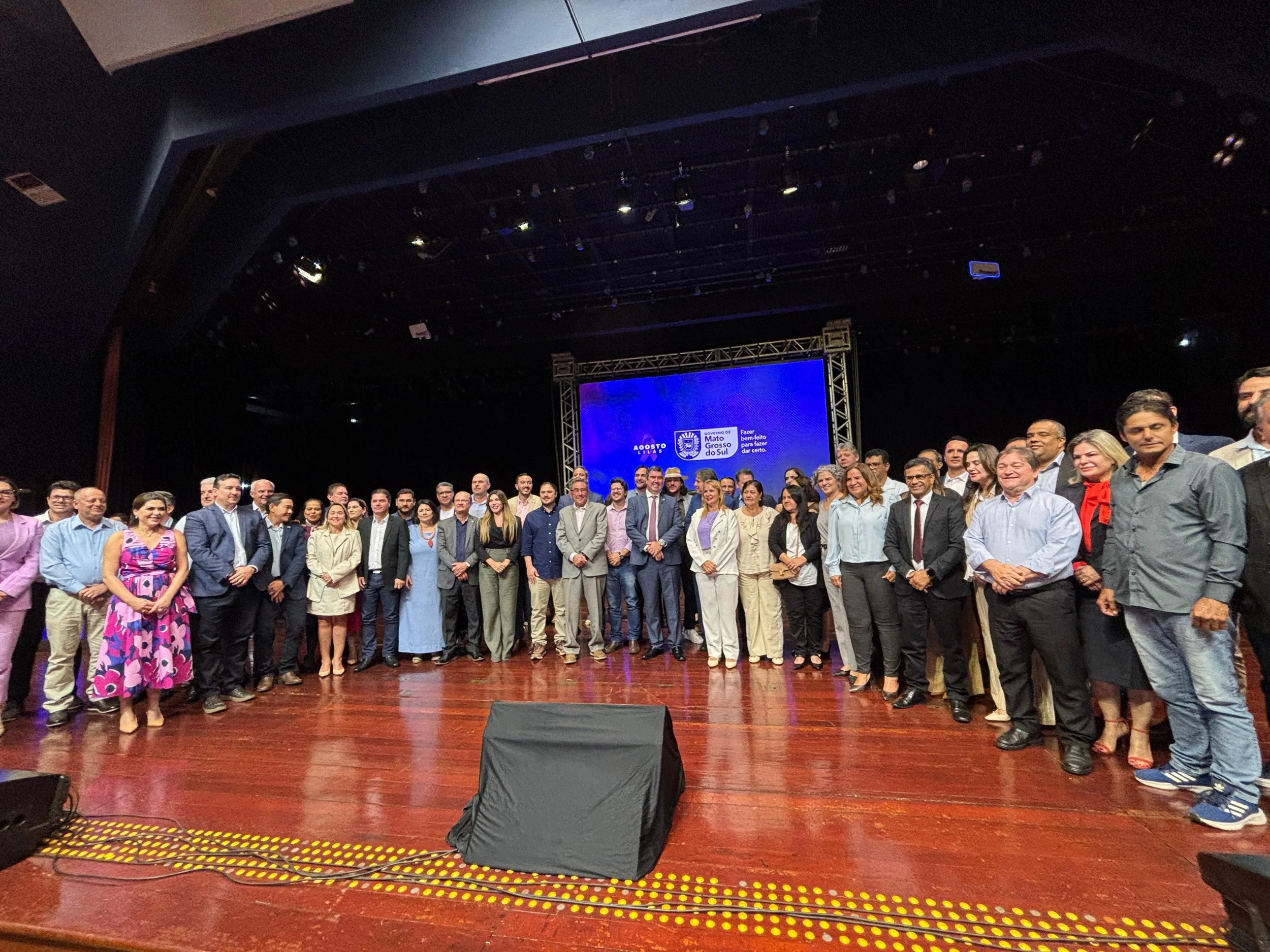 Autoridades no palco do Palácio Rubens Gil de Camillo, sob a liderança do governador Eduardo Riedel, no encerramento do Agosto Lilás. Prefeitos, representantes do Legislativo, lideranças regionais e empresariado reforçaram a união contra a violência de gênero.